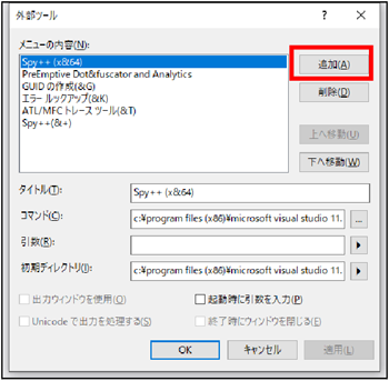 - 外部ツールウィンドウが開きますので、「追加」ボタンをクリックします。