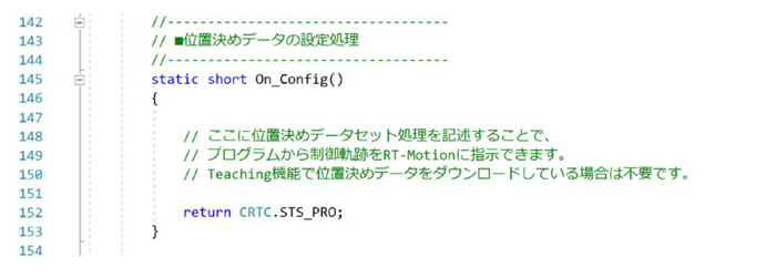 Teaching機能を使わず、プログラムから位置決めデータを指定する場合は、 On_Config() 内に、指定処理を記述します。